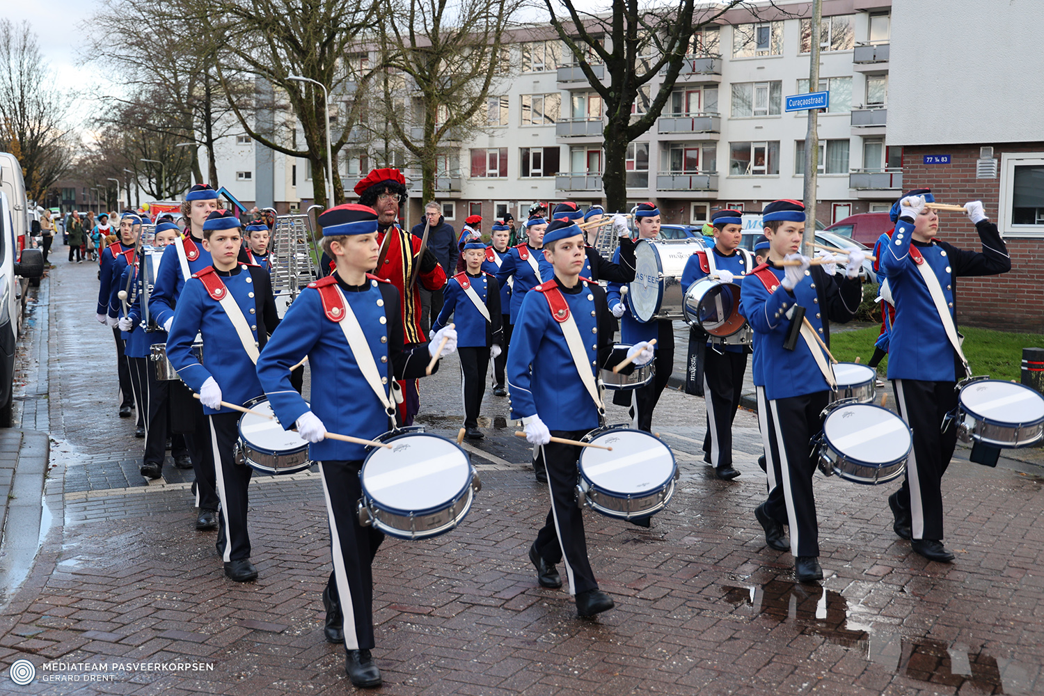 Het was ook ’s middags koud weer met regen en hagel en in overleg met de organisatie werd dan ook de route verkort. Maar het weer mocht de pret van onze toppers niet drukken… ze bleven maar doorgaan! Ook de begeleiding (meezingen met een microfoon) en een cymbal spelende Piet zorgde voor veel plezier.